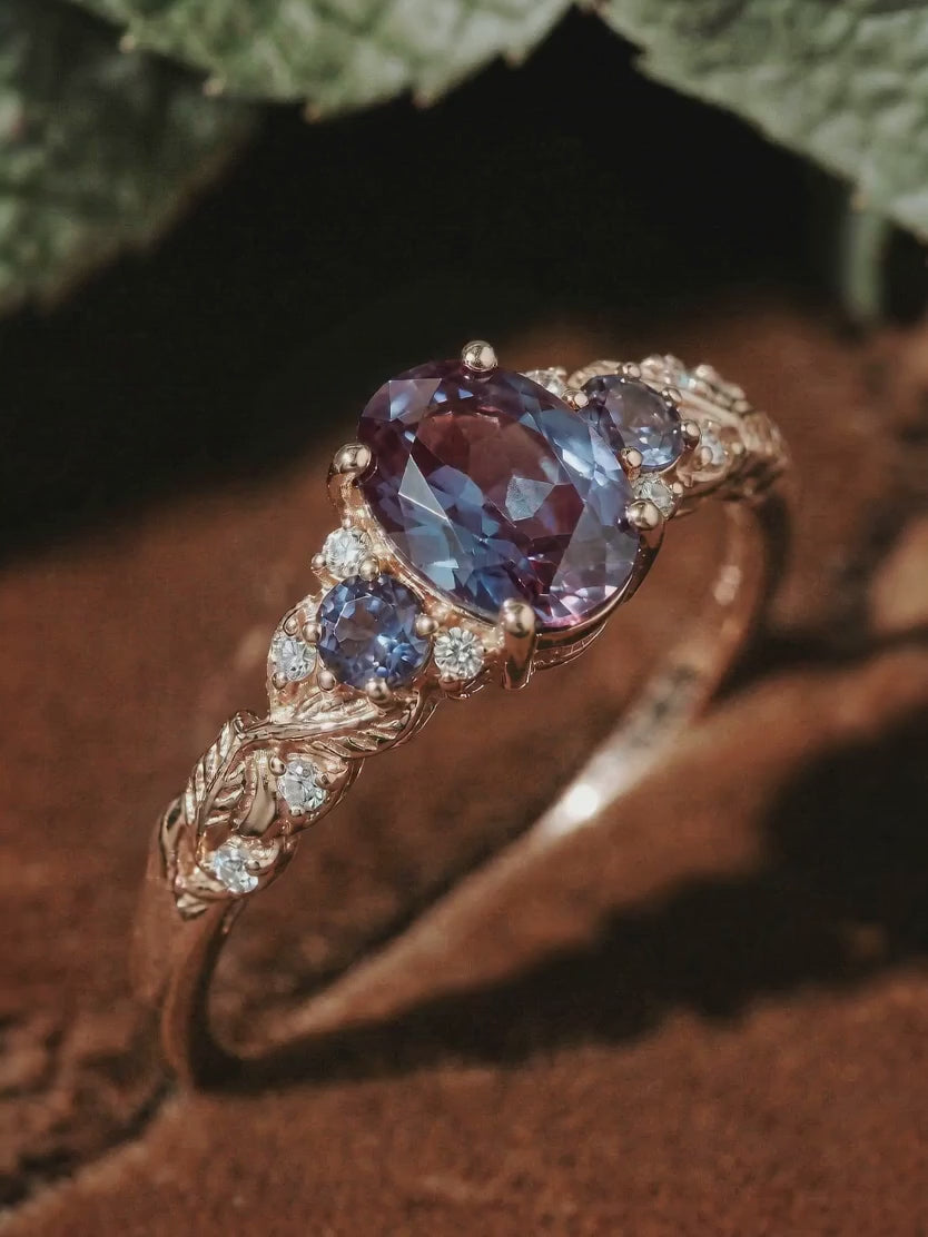 The Calanthe Ring showcases a mesmerizing oval cut lab alexandrite embraced by delicate leaf-inspired details and sparkling accents. Designed to resemble a blossoming branch, this three stone alexandrite engagement ring blends vintage elegance with organic beauty, symbolizing growth, transformation, and everlasting love.